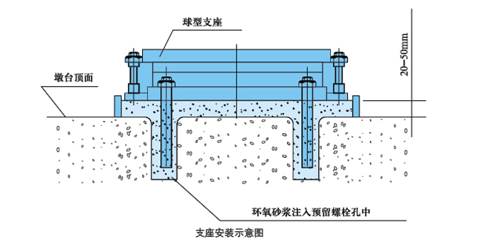 b、安裝支座及地腳螺栓:在下支座板四角用鋼楔塊調整支座水平,并使下支座板底面高出橋墩頂面 20 - 50mm,找正支座縱、橫橋向中線(xiàn)位置,使之符合設計要求。用環(huán)氣砂漿灌注地腳螵栓孔及支座底面墊層 (見(jiàn)下圖>。
