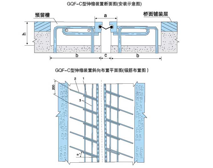 圖中:h、b分別為預留槽深度與寬度,a為錨固筋與邊梁之間的角度,用戶(hù)可根據橋梁實(shí)際預留槽尺寸 選擇GQF~C、GQF-F. GQF-E. GQF—Z. GQF~L中所列任一種,如用戶(hù)有特殊要求,可向我公司提 供具體圖紙,我公司將為您另行設計。