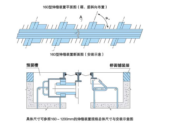 為適應河流方向與行車(chē)路線(xiàn)不垂直的橋梁需要,可將錨固鋼筋和位移控制箱斜向布置,即將伸縮量為0~ 80mm的各種伸縮裝置及I60~1200mm的模數式伸縮裝置的錨固鋼筋及位移控制箱水平傾斜的焊在異型邊梁 上,其錨固鋼筋與邊梁的交角隨橋梁的傾斜方向與傾斜程度而改變。