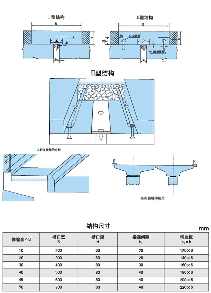 按橋梁縱坡坡度,分為兩種結構形成:I型和II型。丨型適合于縱坡小于2%的橋梁伸縮接縫。II型適用于縱 坡大于等于2%的橋梁接縫,兩者的區別在于是否設置膨脹螺栓和鋼筋。
