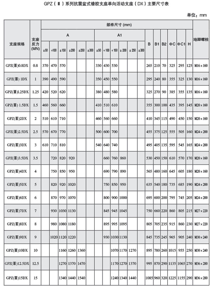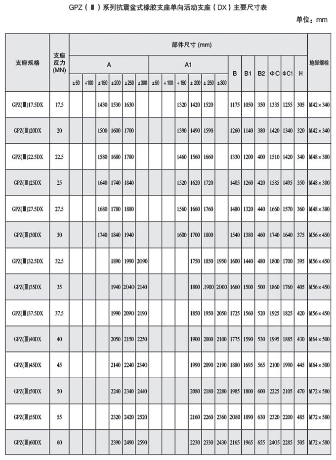盆式橡膠支座按其使用時(shí)的位移能力分為二類(lèi),即單向活動(dòng)支座具有豎向 轉角功能和單一方向位移功能,代號DX;