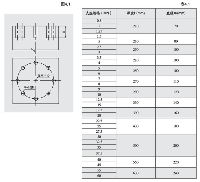 a.澆注壤臺墊石時(shí),在墊石頂面做出地腳蜾栓套筒預留孔。如圖4.1所示,預留孔深度及直徑見(jiàn)表4.1。