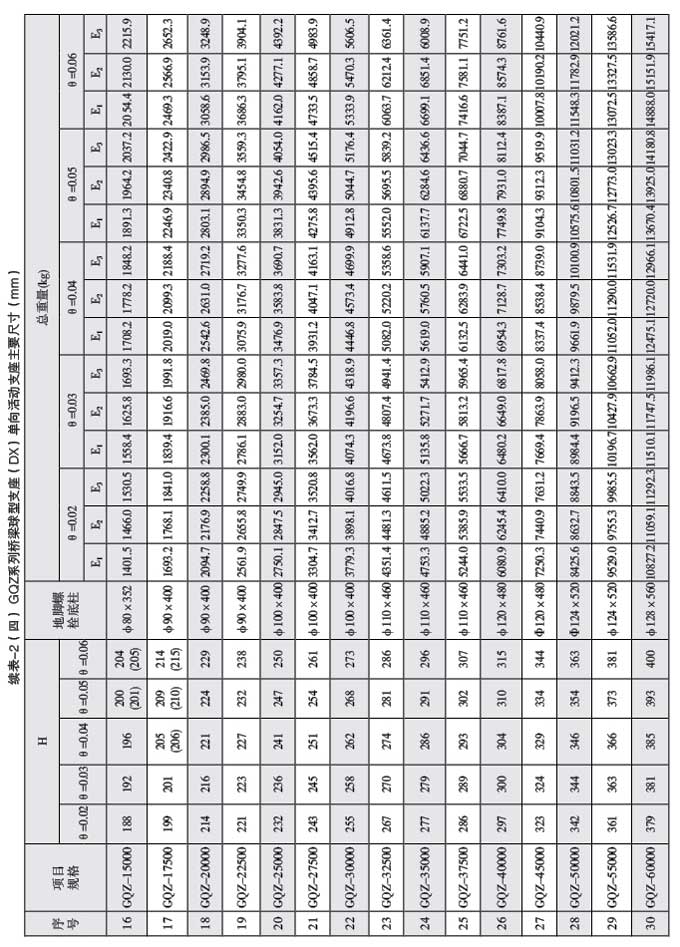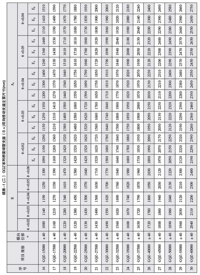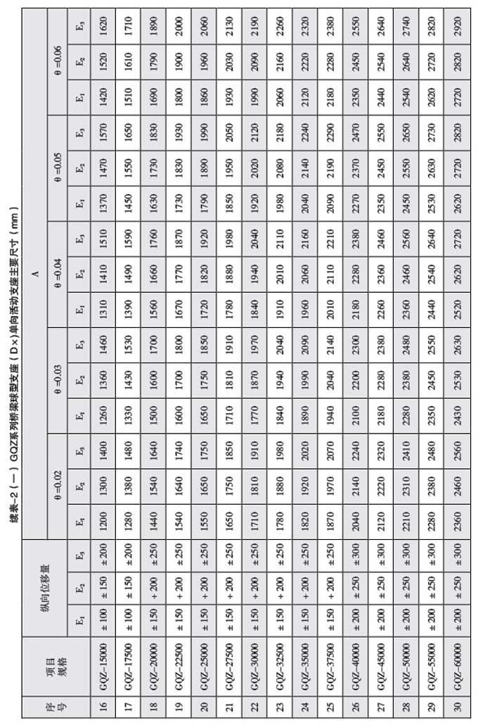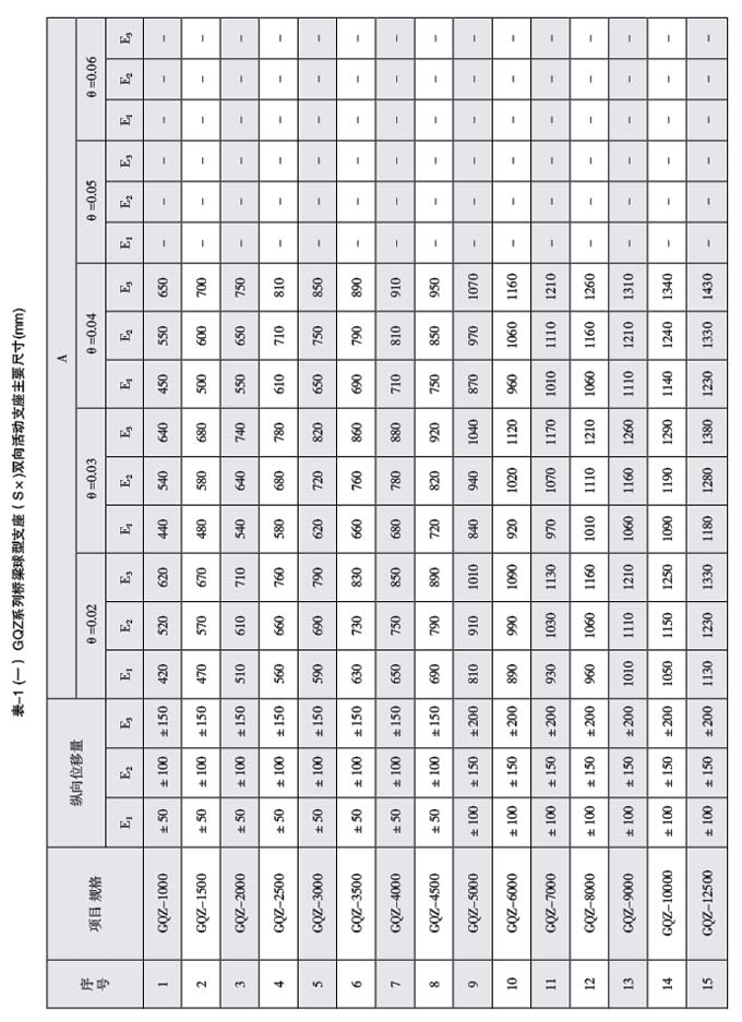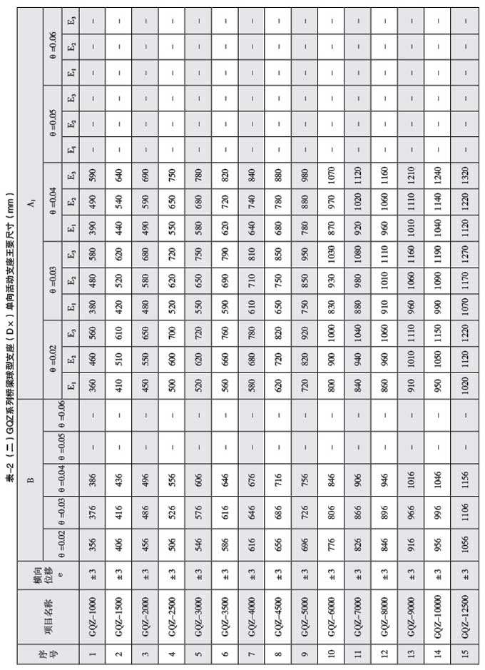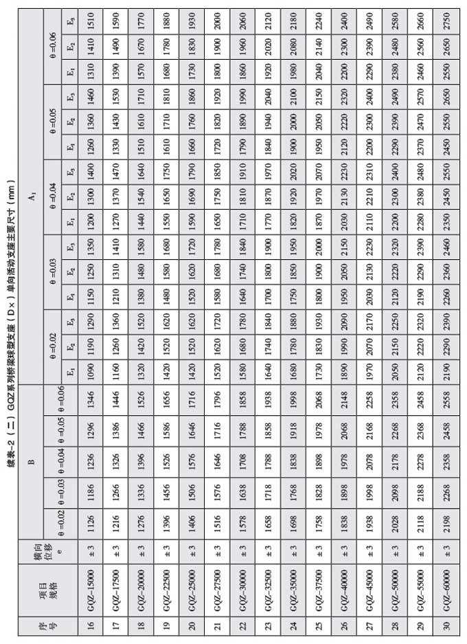 橫向位移:SX(雙向活動(dòng)支座),1000~9000kN, e=±20mm, 10000~60000kN, e=±40mm DX(單向活動(dòng)支座)e=±3mm,支座縱向、橫向位移量還可根據實(shí)際需要進(jìn)行調整。